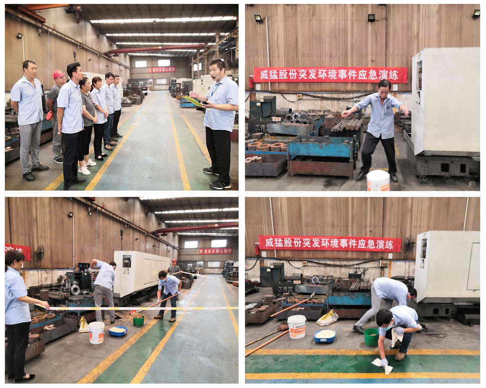 2020年8月31日中午,威猛股份開展了突發(fā)環(huán)境事件應(yīng)急演練。演練以廢液壓油污染地面為假象事件而展開,此次演練目的旨在檢驗公司危廢物應(yīng)急處置是否合理,環(huán)境應(yīng)急隊伍的應(yīng)急反應(yīng)及應(yīng)急預(yù)案的科學(xué)性、合理性和