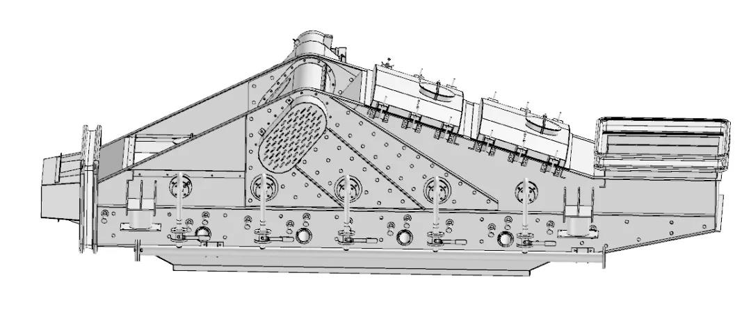 其中激振器為法蘭式激振器,安裝在篩體的篩幫上,可以減小設(shè)備高度,節(jié)約現(xiàn)場(chǎng)空間;篩體上安裝有密封蓋密封,進(jìn)、出料口安裝有軟連接密封;可以實(shí)現(xiàn)全密封結(jié)構(gòu)設(shè)計(jì)。