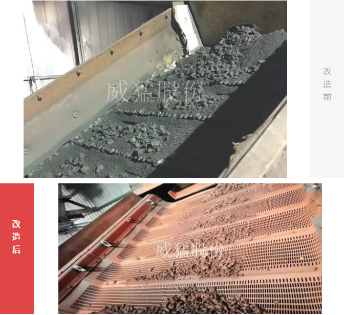 山西某鋼廠經(jīng)調(diào)查對比,在改造時選用了威猛股份塊礦復(fù)頻篩。塊礦改造前的振動篩嚴重堵料,篩分效果不好,污染高,篩板使用壽命短。而威猛股份塊礦復(fù)頻篩篩分效率能達到88%以上,透篩率高,無揚塵,無漏料,滿足污染小要求,篩板使用壽命長,易維護,客戶反饋非常好用!