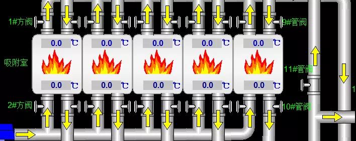 管道上方的黃色箭頭代表氣流的方向,當(dāng)主風(fēng)機(jī)、脫附風(fēng)機(jī)以及相應(yīng)閥門打開時(shí),管道上面的黃色箭頭會(huì)以閃爍的狀態(tài)顯示在相應(yīng)的位置。