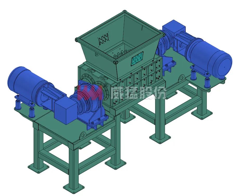 雙軸撕碎機主要由箱體、主軸組件、定刀組件、進料斗組件、減速電機、底架等組成。采用雙軸獨立驅(qū)動,通過安裝在主軸上刀具的擠壓與剪切,將物料撕碎到規(guī)定的粒徑以下。