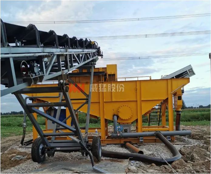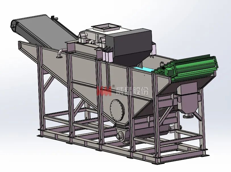 威猛股份研發(fā)設計的水力浮選機有別于傳統(tǒng)浮選機的是,在浮選機上方增加振動給料機和導料槽,使物料經(jīng)振動給料機均勻地下落,再經(jīng)導料槽后速度變緩,增加輕物質的分離時間,易于輕物質的分離。同時對回水結構進行優(yōu)化改進,增強回水性能,保證水流方向,從而穩(wěn)定輕物質的運行方向。