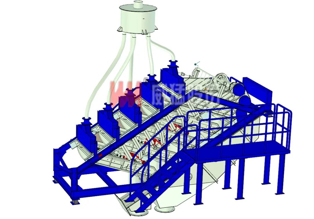 WFBS-D分布篩是威猛股份研發(fā)升級的新型篩分設(shè)備。其采用統(tǒng)一的振動源驅(qū)動多層篩箱共同振動且采用獨(dú)立篩分系統(tǒng)的篩箱上下錯落分層布置,各層篩面獨(dú)立完成給料、篩分作業(yè),各層篩面的篩下物、篩上物分別匯集排出。
