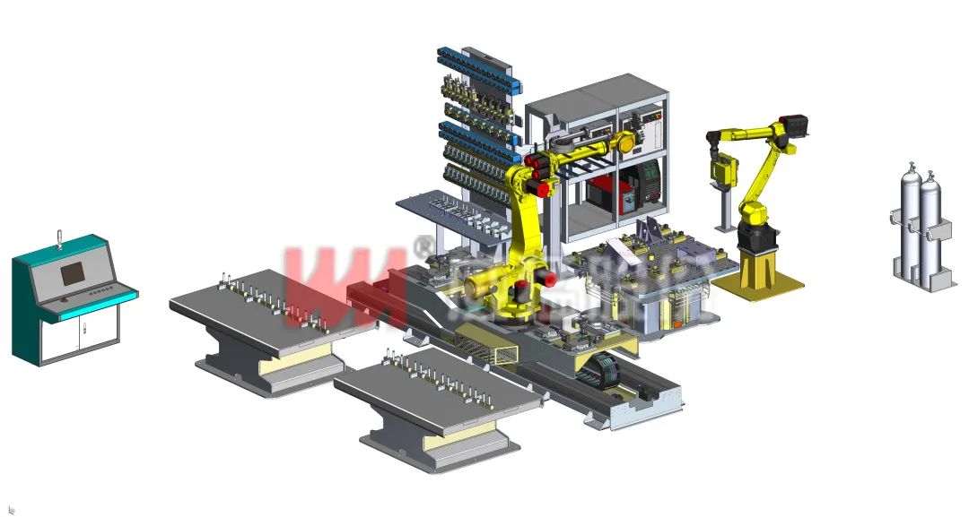 威猛股份開發(fā)的柔性拼裝焊接單元,根據(jù)工裝的特定需求,有針對性的柔性選取對應(yīng)夾裝工具,在特定工作平臺上快速搭建出工裝模型,進(jìn)而順利開展后續(xù)的對接及焊接工作,在批量焊接任務(wù)完成后,自動完成工裝拆卸并且能夠循環(huán)使用。此單元的核心在于“數(shù)字化柔性工裝”,致力于解決多種類、多規(guī)格、多批次、少批量產(chǎn)品的焊接作業(yè)問題。