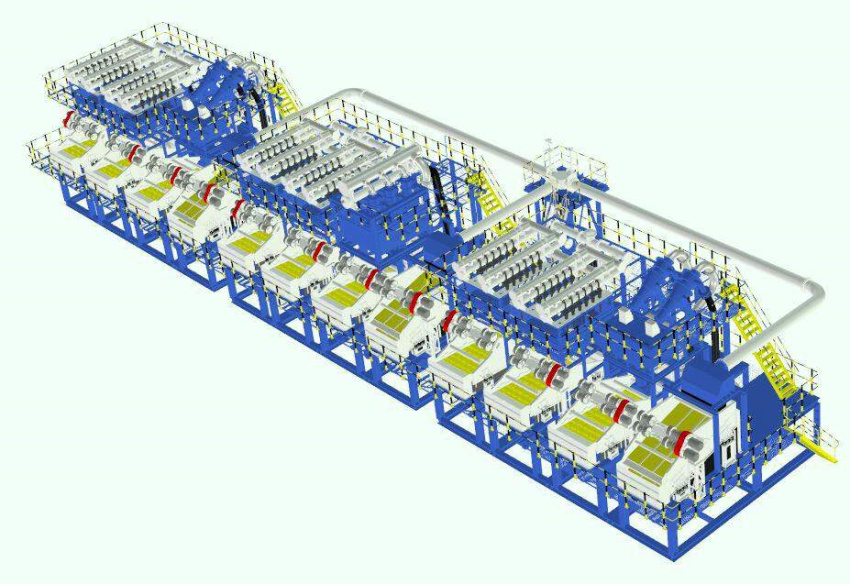 WNX-3000泥水分離設備由三套WNX-1000泥水分離設備組成。WNX-1000主要由粗篩單元、一 級循環(huán)單元和二級循環(huán)單元組成,總計泥漿的處理量能達到3000m3/h。整體采用模塊化設計,可根據(jù)工程具體要求進行系統(tǒng)拆分組合,具有較強的工程適用性。