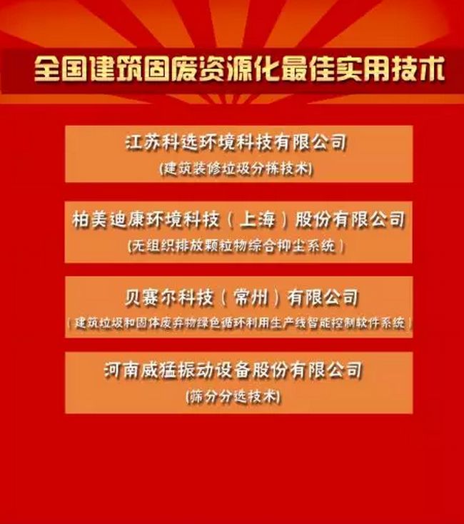 近期,中國砂石協(xié)會建筑固廢利用分會專家組成員,對我公司的技術(shù)及項目資料進(jìn)行了嚴(yán)格審核,并結(jié)合市場調(diào)研,一致認(rèn)為我公司篩分分選技術(shù)符合建筑固廢資源化各項要求,成功當(dāng)選2017-2018年度全國建筑固廢資